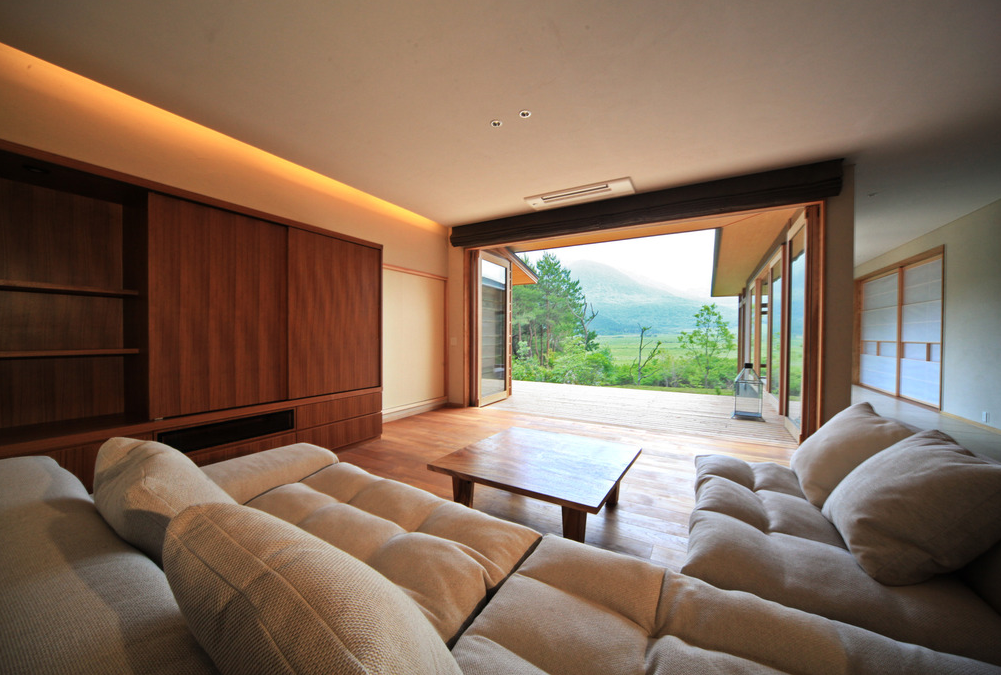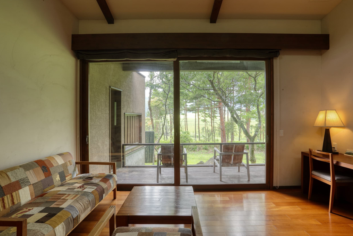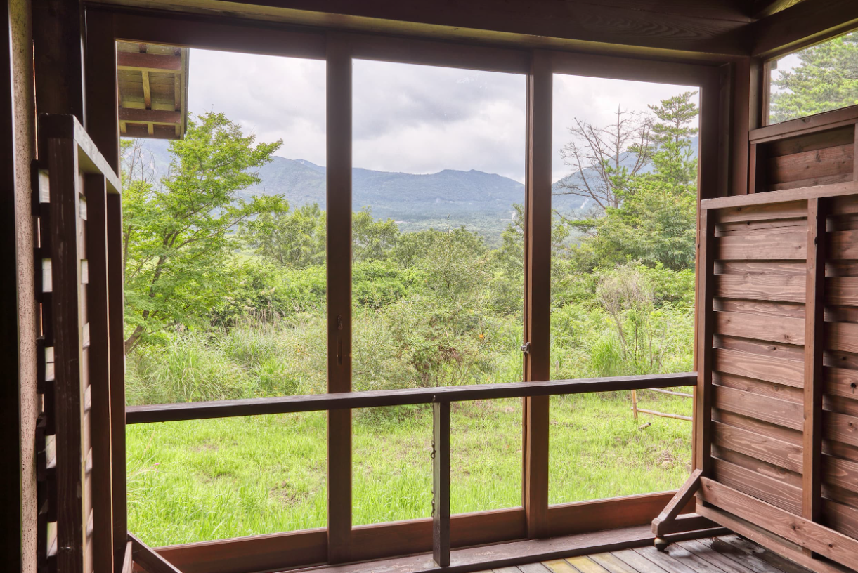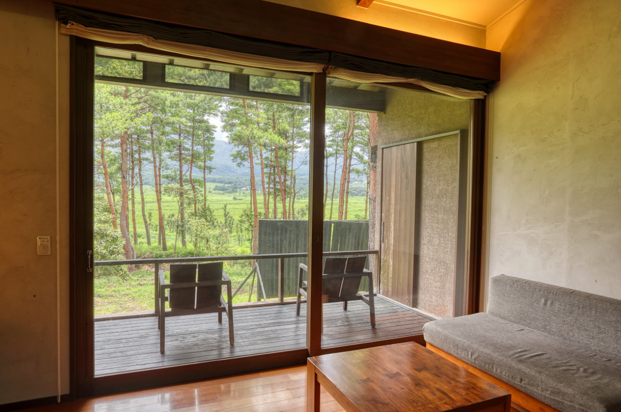 거실의 커다란 창문을 통해 바라보는 쿠쥬 고원의 절경은 보는 것만으로도 마음의 치유가 되는 것 같은 편안함이 느껴집니다. 실내에 계단이 있기 때문에 어르신이나 다리가 불편한 분들은 다른 방을 추천드려요)