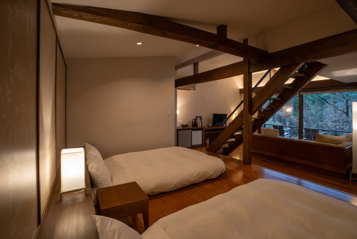 쿠오리테이에서 가장 프라이빗한 객실로 무려 164㎡의 넓은 부지에 위치한 별채로, 거실과 침실, 다다미방, 다이닝룸, 전용 내탕과 전용 노천탕을 갖추고 있습니다. 4명 이상의 인원과 함께 한다면 이곳을 추천드립니다.