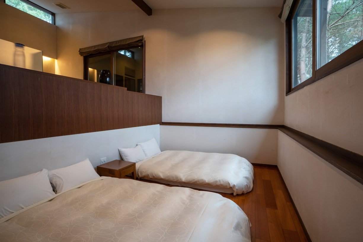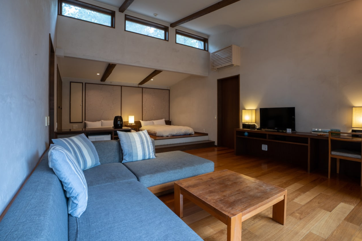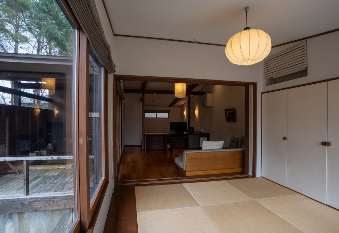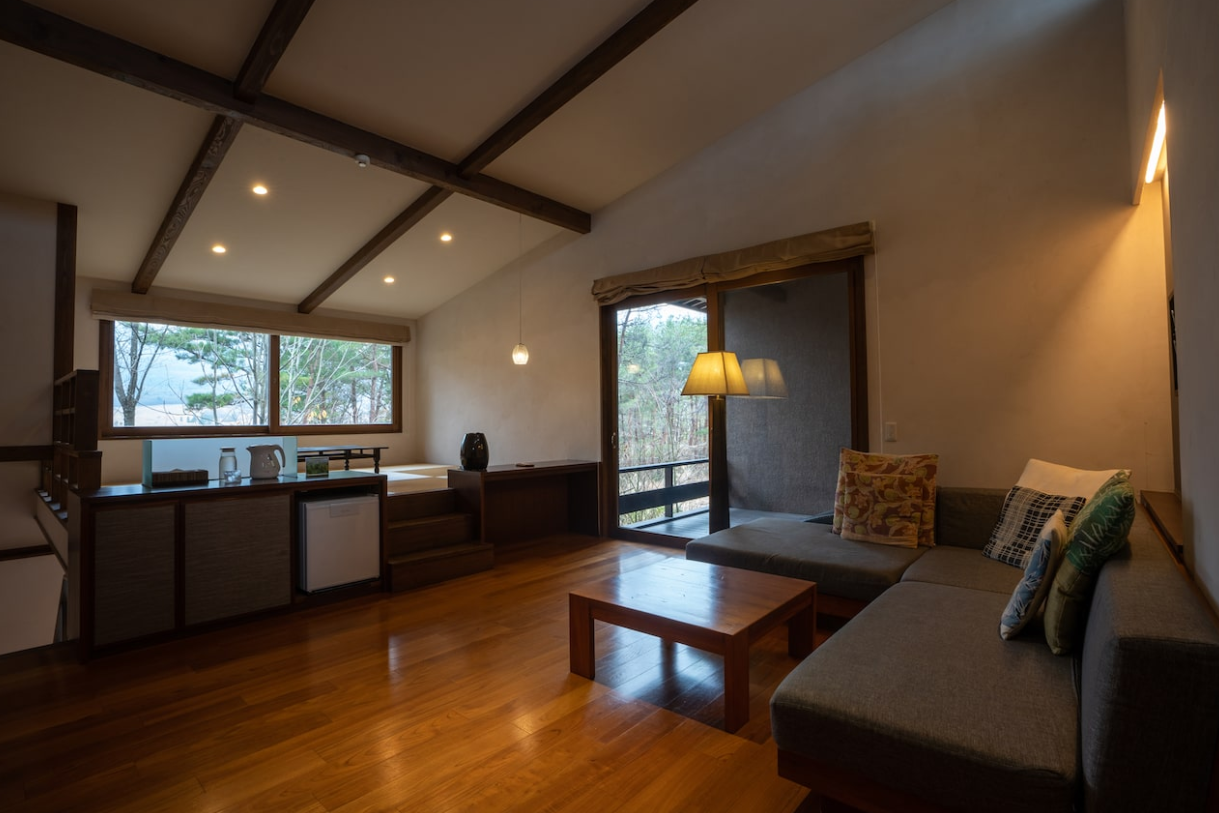 토키와 마찬가지로 숙소가 2층에 있기 때문에 계단을 올라야 합니다. 또 객실 내 침실도 계단으로 내려가야 하기에 가급적 몸이 불편하시거나 어르신을 모셔가실 경우 유의하셔야 합니다. 거실 공간의 창 앞으로 작은 다다미 공간에서 창밖의 쿠주고원을 바라보며 차 한잔 하는 것도 매력적인 방입니다.