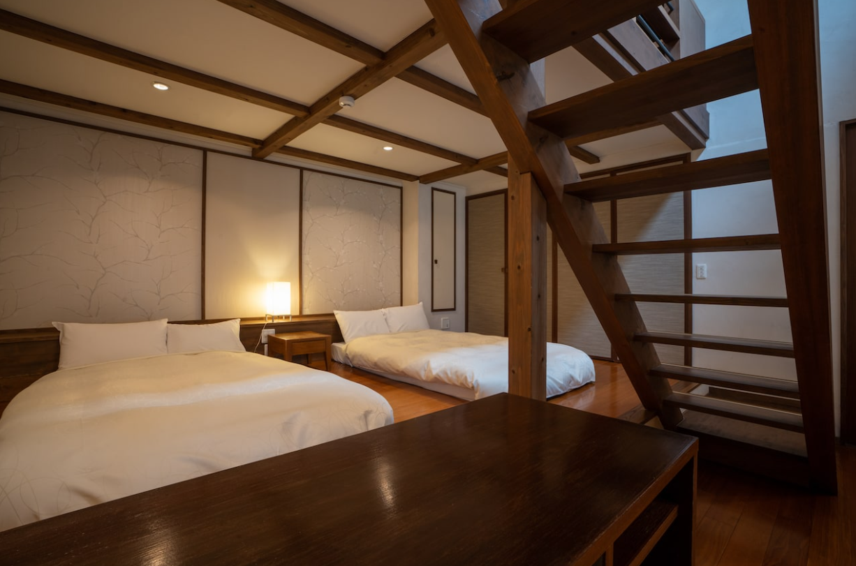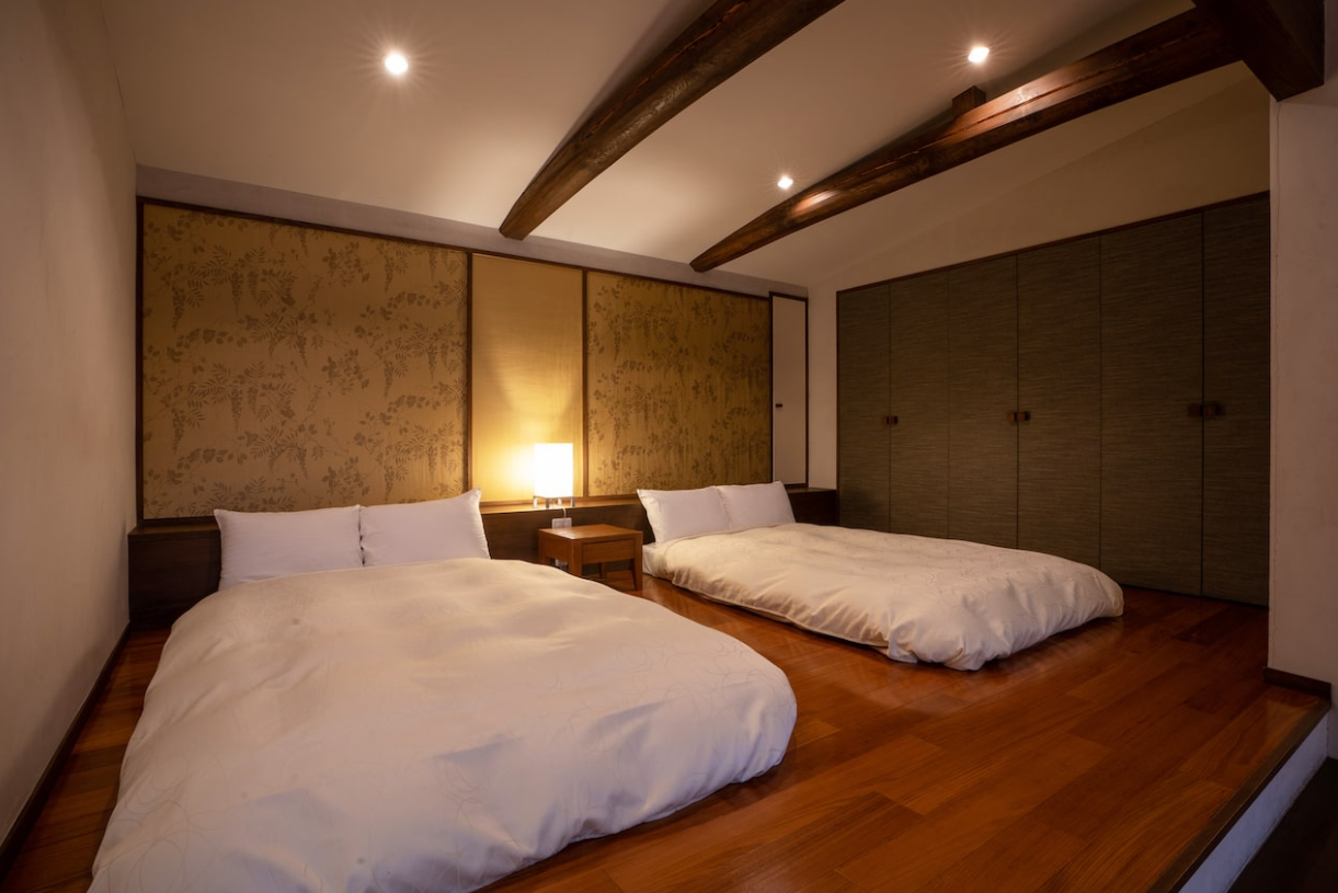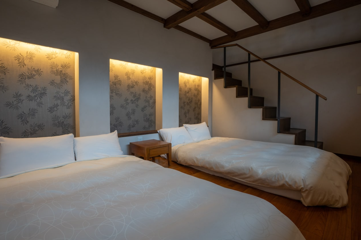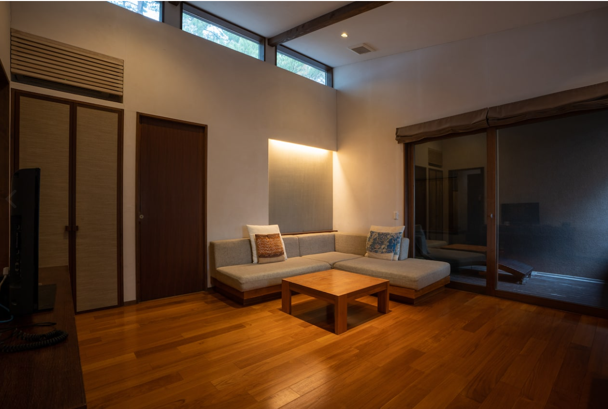 토키와 마찬가지로 숙소가 2층에 있기 때문에 계단을 올라야 합니다. 또 객실 내 침실도 계단으로 내려가야 하기에 가급적 몸이 불편하시거나 어르신을 모셔가실 경우 유의하셔야 합니다. 거실 공간의 창 앞으로 작은 다다미 공간에서 창밖의 쿠주고원을 바라보며 차 한잔 하는 것도 매력적인 방입니다.
