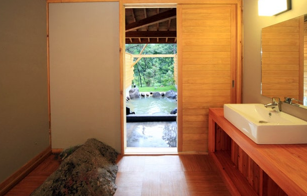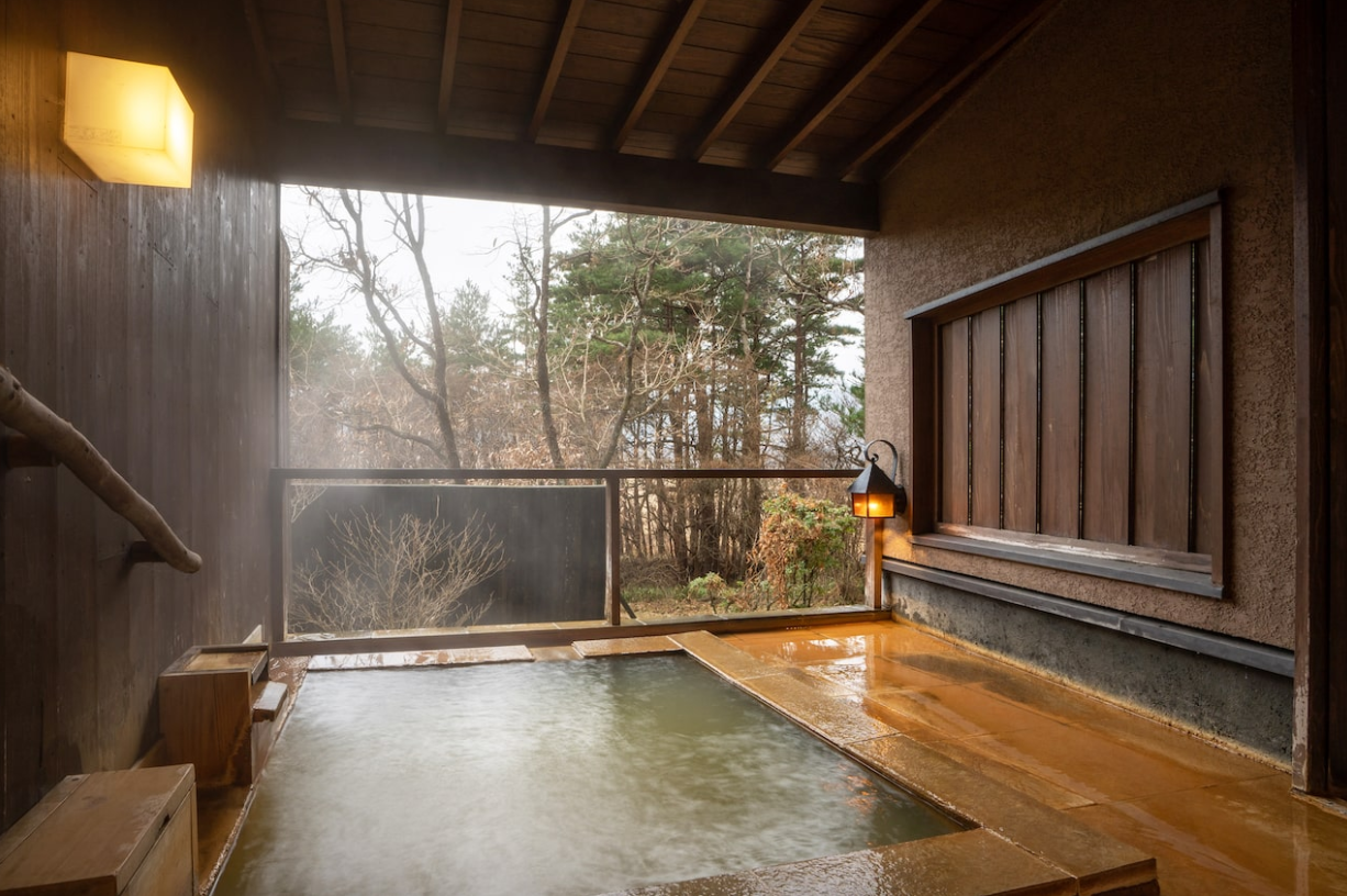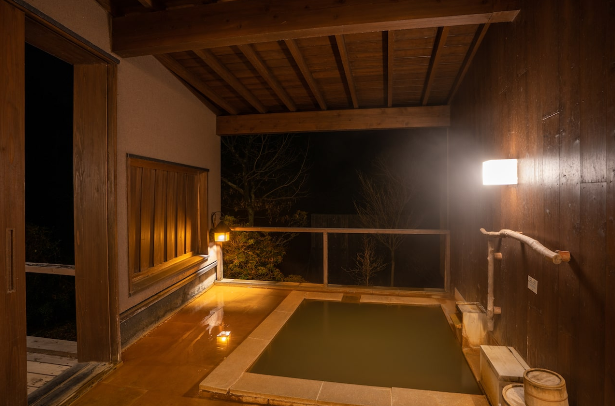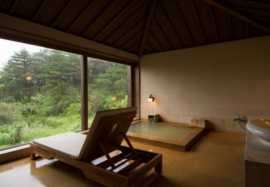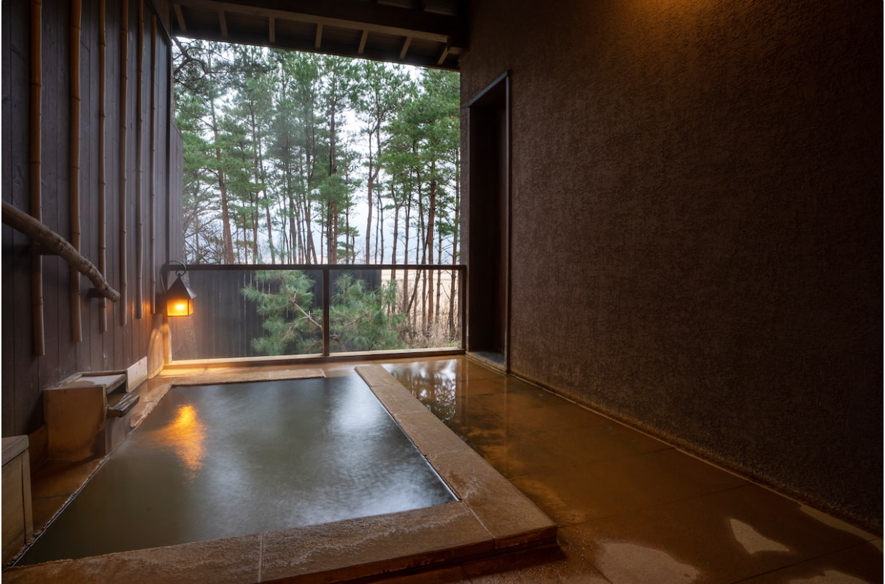쿠오리테이 료칸의 모든 객실에는 객실 전용 반노천탕이 딸려있습니다. 전 객실이 바디 별장 스타일의 별채동으로 되어있어 프라이빗하게 온천과 휴식을 즐 길 수 있습니다. 온천 후 옆에서 풍욕과 삼림욕도 같이 즐길 수 있기 때문에 좋은 료칸에서 즐기지 못했던 풍욕도 함께 즐겨보세요~