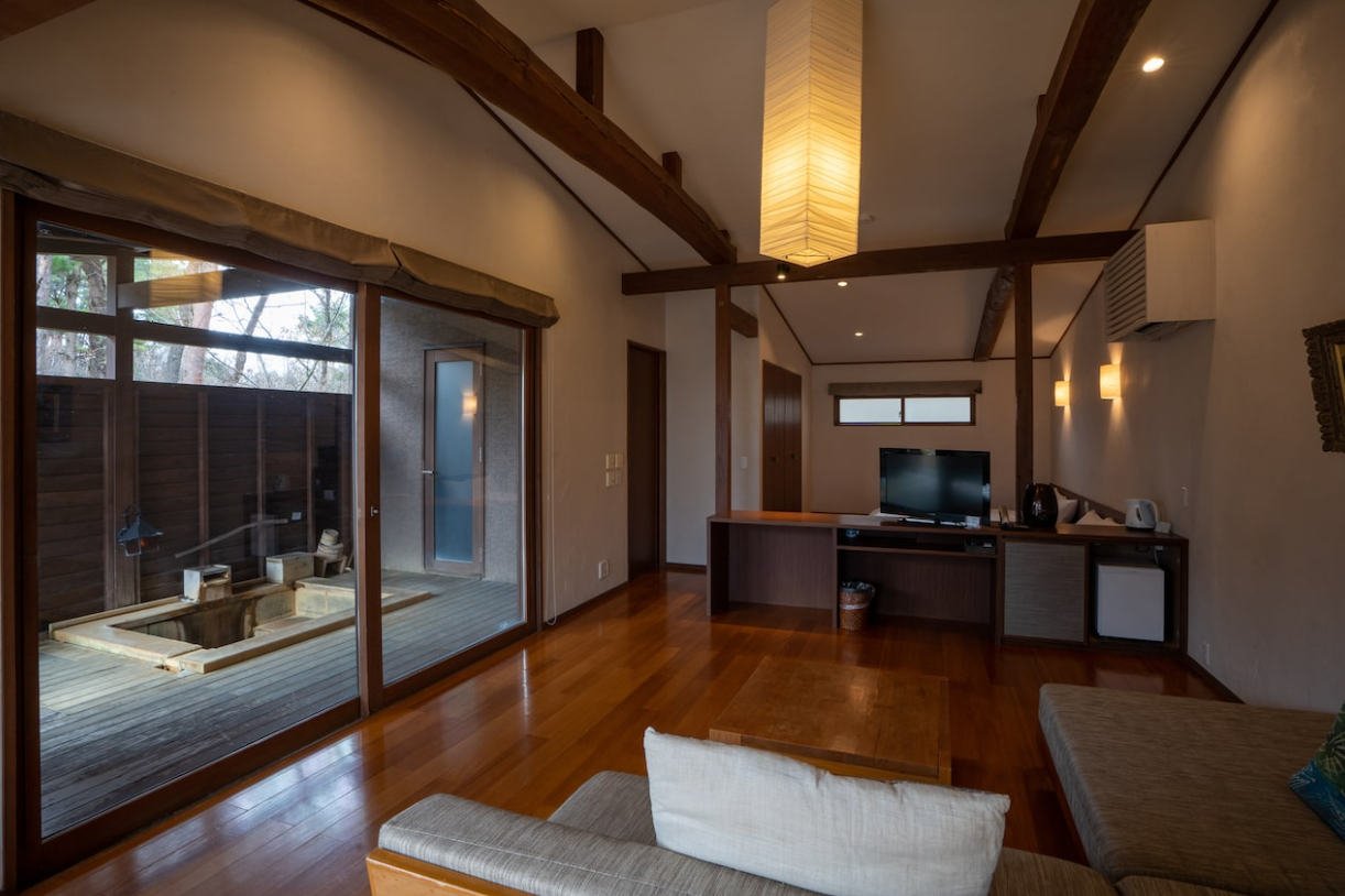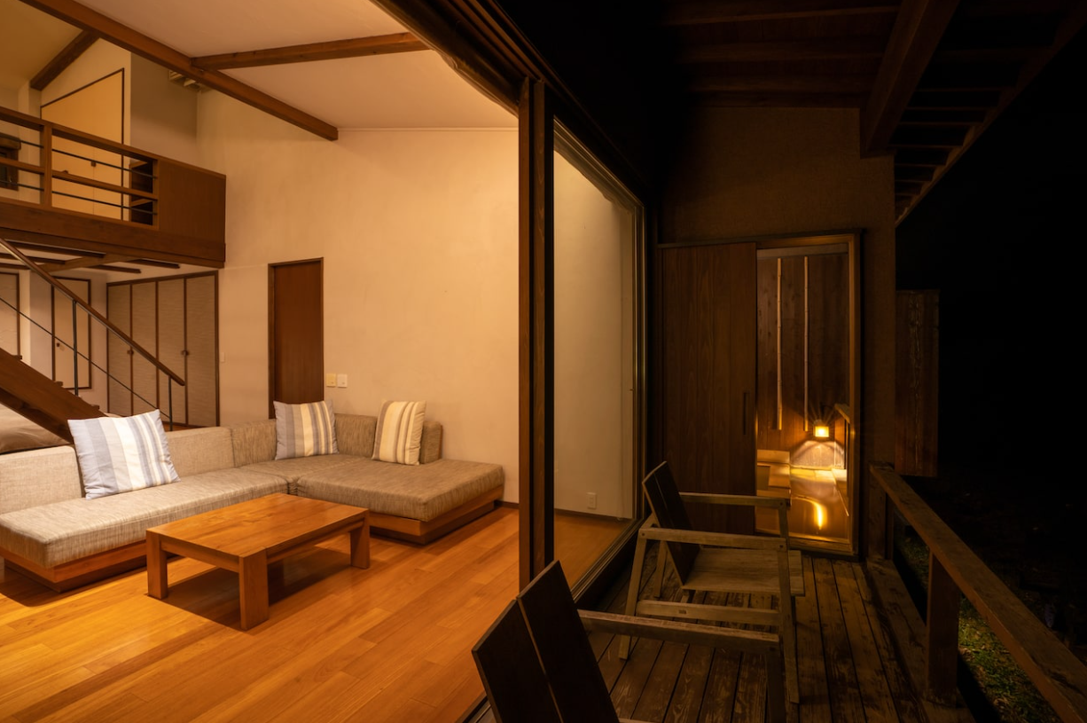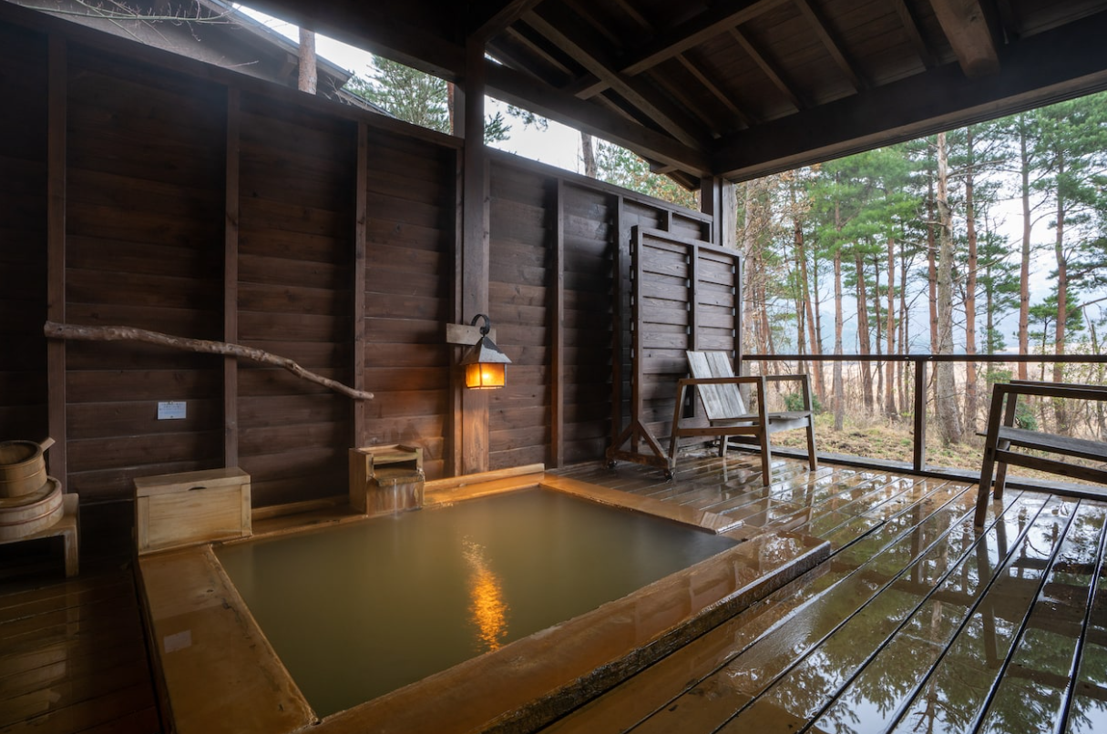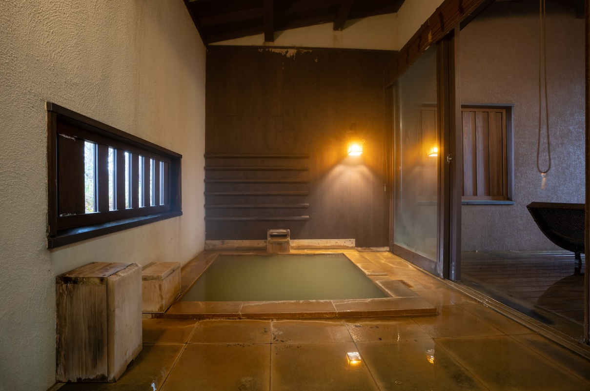 쿠오리테이 료칸의 모든 객실에는 객실 전용 반노천탕이 딸려있습니다. 전 객실이 바디 별장 스타일의 별채동으로 되어있어 프라이빗하게 온천과 휴식을 즐 길 수 있습니다. 온천 후 옆에서 풍욕과 삼림욕도 같이 즐길 수 있기 때문에 좋은 료칸에서 즐기지 못했던 풍욕도 함께 즐겨보세요~