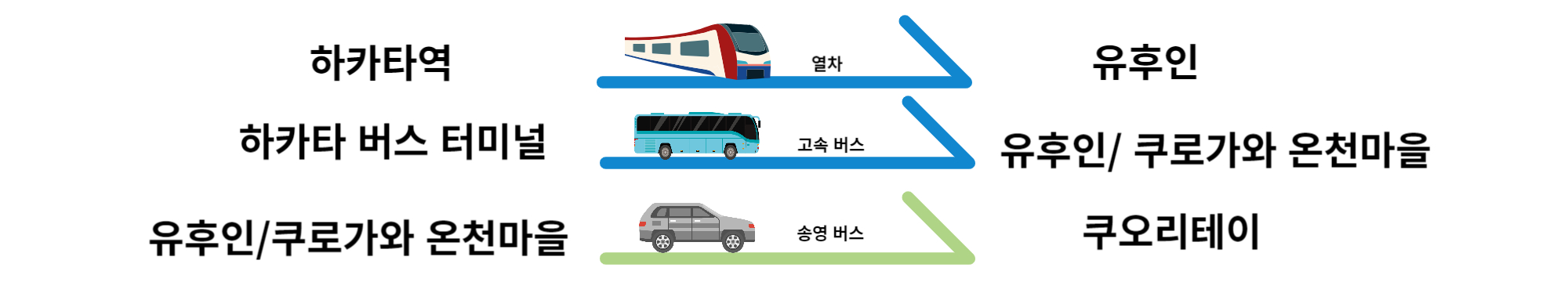 카이 아소와 같이 쿠주고원에 위치한 쿠오리테이료칸은 유후인에서 차로 약 40분을 달려가 아소 쿠주 국립공원 내에 있는 료칸입니다. 렌터카 이용이나 사전에 송영서비스를 예약하지 않으면 접근성이 안 좋다는 단점이 있긴 하지만 그 단점을 모두 커버할 만큼 만족할 휴식 공간입니다. 송영서비스를 놓치신 경우에는 택시로 이동하셔야 하는데 10만 원은 훌쩍 넘는 금액을 지불하셔야 하기에 료칸 예약 시 송영서비스는 꼭 잊지 마시고 하셔야 합니다.