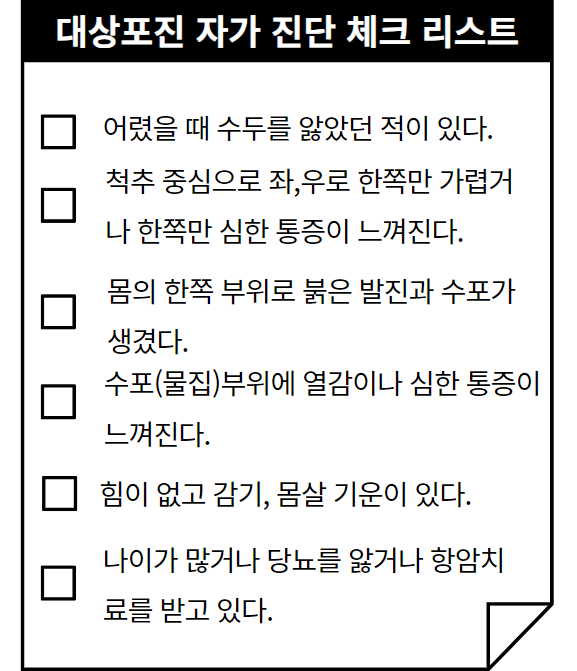 대상 포진 바이러스는 수두바이러스와 동일하기 때문에 어릴 때 수두를 앓은 경험이 있다면