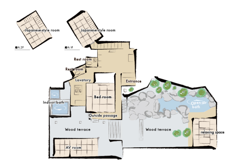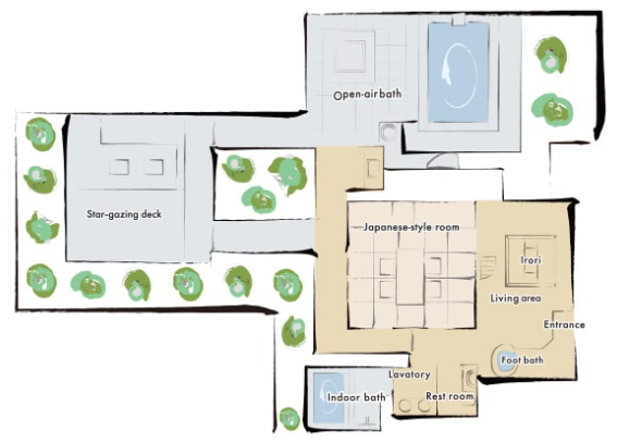 정원 6명 | 10조 화실 + 6조 이로리 + 메조네트 + 14조 침실 | 5m의 노천탕 + 바위 내탕 + 족탕 + 침탕 |