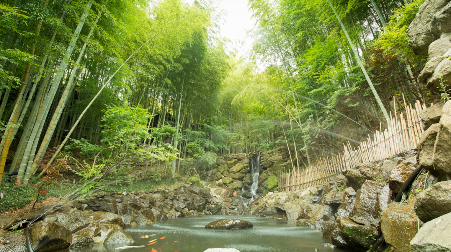 실내탕에 설치된 우드 데크에서 대나무 숲을 내려다보면 작은 폭포도 만나볼 수 있습니다.