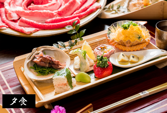 정원 3명 | 10조 화실 + 6조 이로리 + 메조네트 + 호시미 갑판 | 5m의 노천 욕탕 + 노천 족탕 + 히노키 내탕 |
