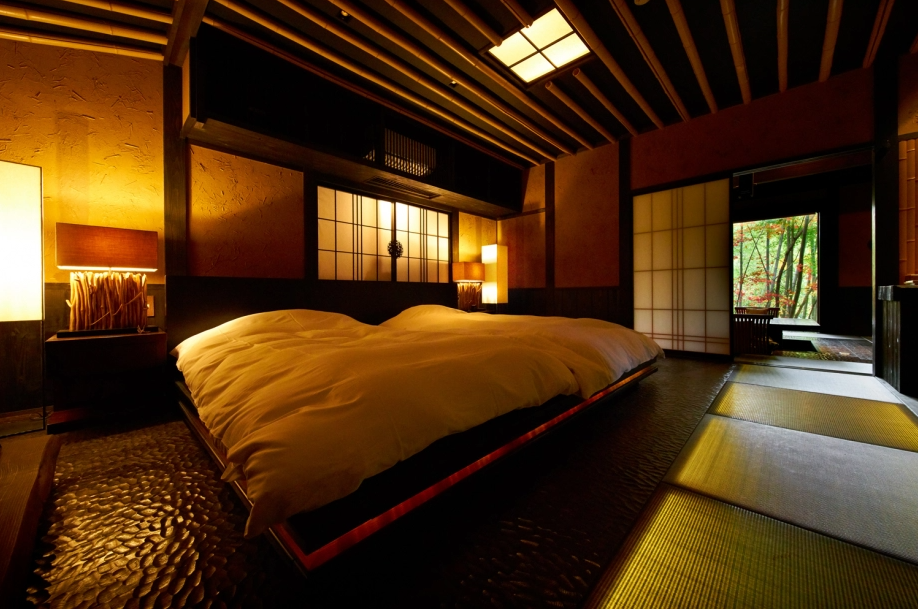 료칸 내에서 가장 안쪽에 위치한 객실로 천연욕을 즐기는 듯한 노천 온천이 매력적입니다. 큰 창이 설치되어 있는 실내 온천에서는 노천 온천 쪽을 전망할 수 있습니다. 료칸 내의 가장 안쪽으로 계단을 이용해 야하기 때문에 어르신을 모시고 가시거나 몸이 불편하신 분들은 다른 객실을 추천드립니다.