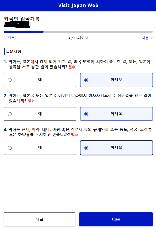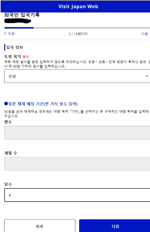 입국 목적과 체류일자를 입력 후 다음 클릭 -> 외국인 입국기록 질문에 답하신 후 다음페이지로 넘어갑니다.