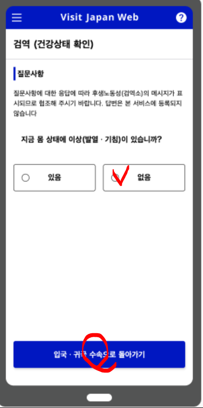 검역을 눌러서 해당 질문에 답변하고 건강상태에 따른 안내를 확인합니다.