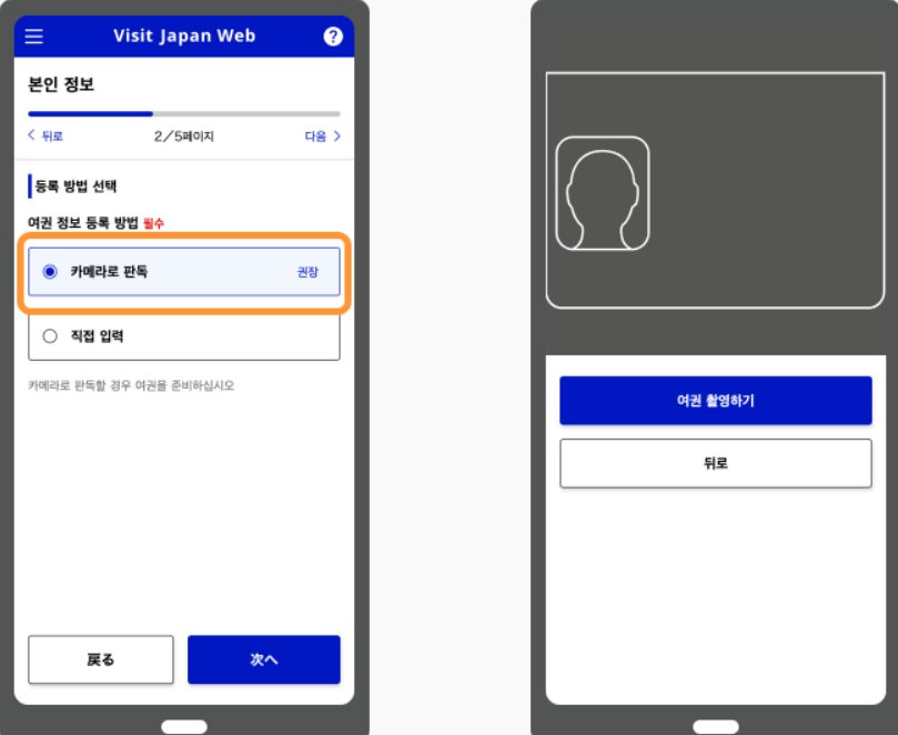 여권 정보의 등록 방법은 카메라로 스캔하거나 직접 입력 중 하나를 선택하셔야 합니다.