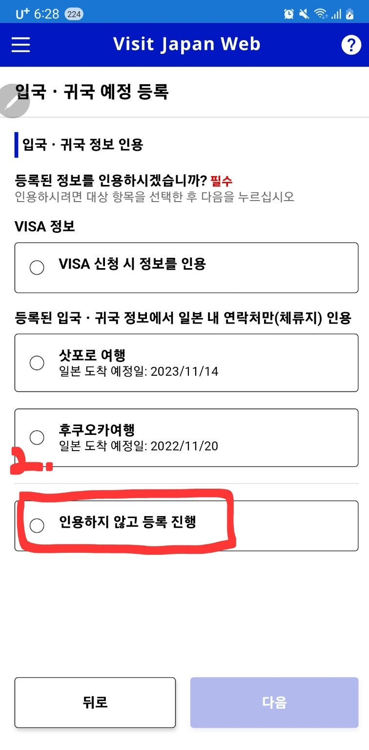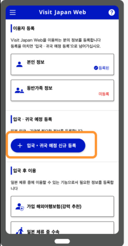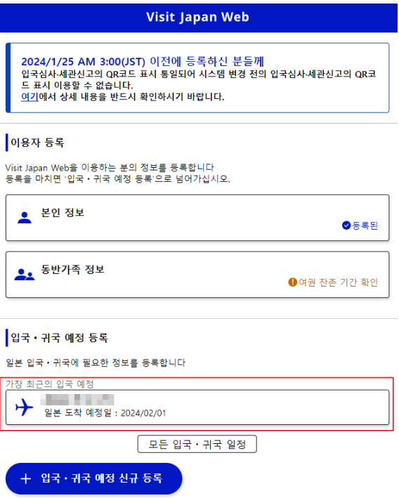 다시 홈으로 돌아가서 3번에서 등록했던 가장 최근의 입국 예정을 선택해 줍니다.