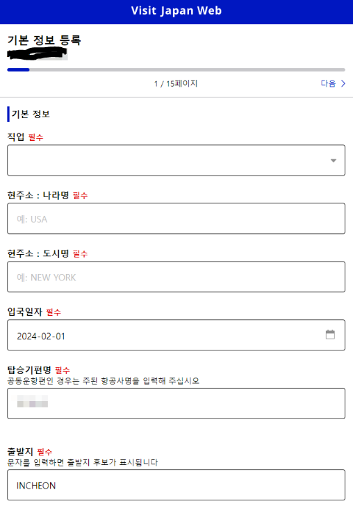 직업과 국가, 도시명, 입국일자, 탑승기 편명, 출발지를 입력하고 다음을 클릭해 줍니다.