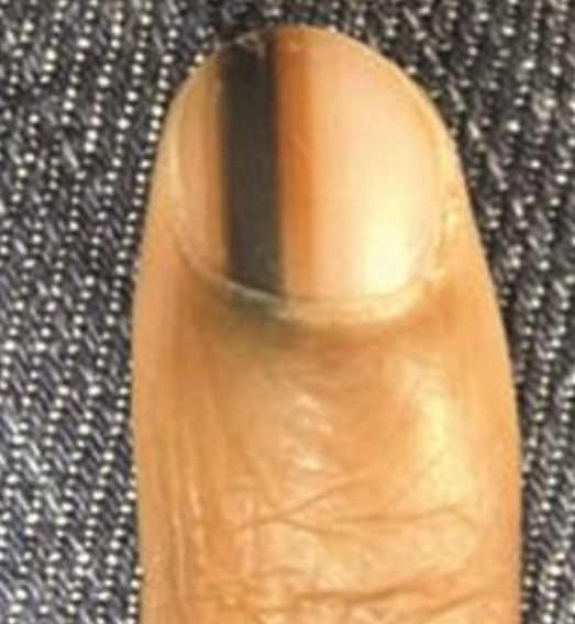 또, 손톱 주위의 피부가 반복된 자극을 받으면 손톱의 뿌리 부분에 멜라닌 색소의 과다 생성으로 손톱에 검은색의 세로 줄무늬가 생기기도 합니다.