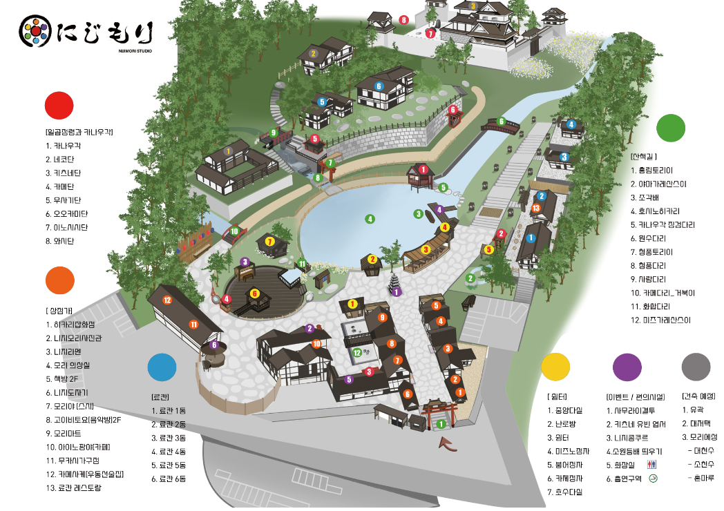 | 부대시설 | 기모노대여샵(모리의상실), 마트(모리마트), 잡화점(히카리잡화점), 도자기상점(간지도자기), 사진관(천의미소), 책방, LP바(고이비토요), 오락실 |