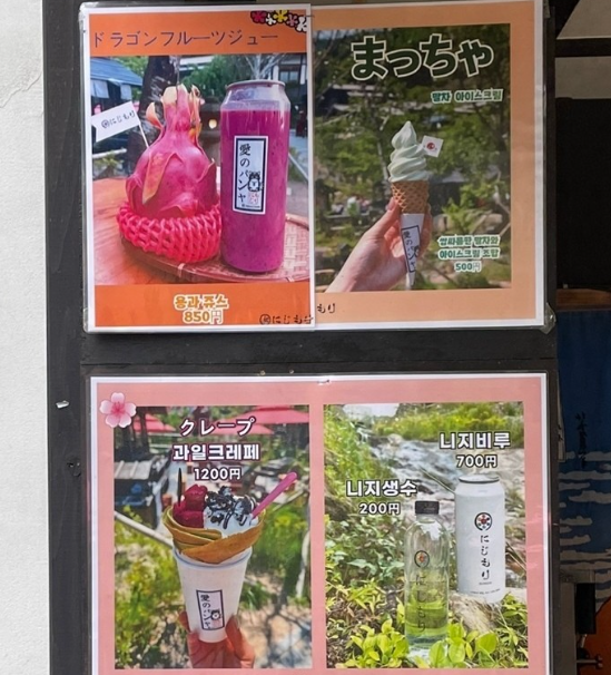 | 메뉴 | 용과쥬스,말차아이스크림,과일크레페,통파인애플쥬스,망고쥬스,니지비어&니지생수 | 야키토리, 하시마키, 타코야키, 당고, 얼음빙수, 니지비루&아사히 생맥주 |