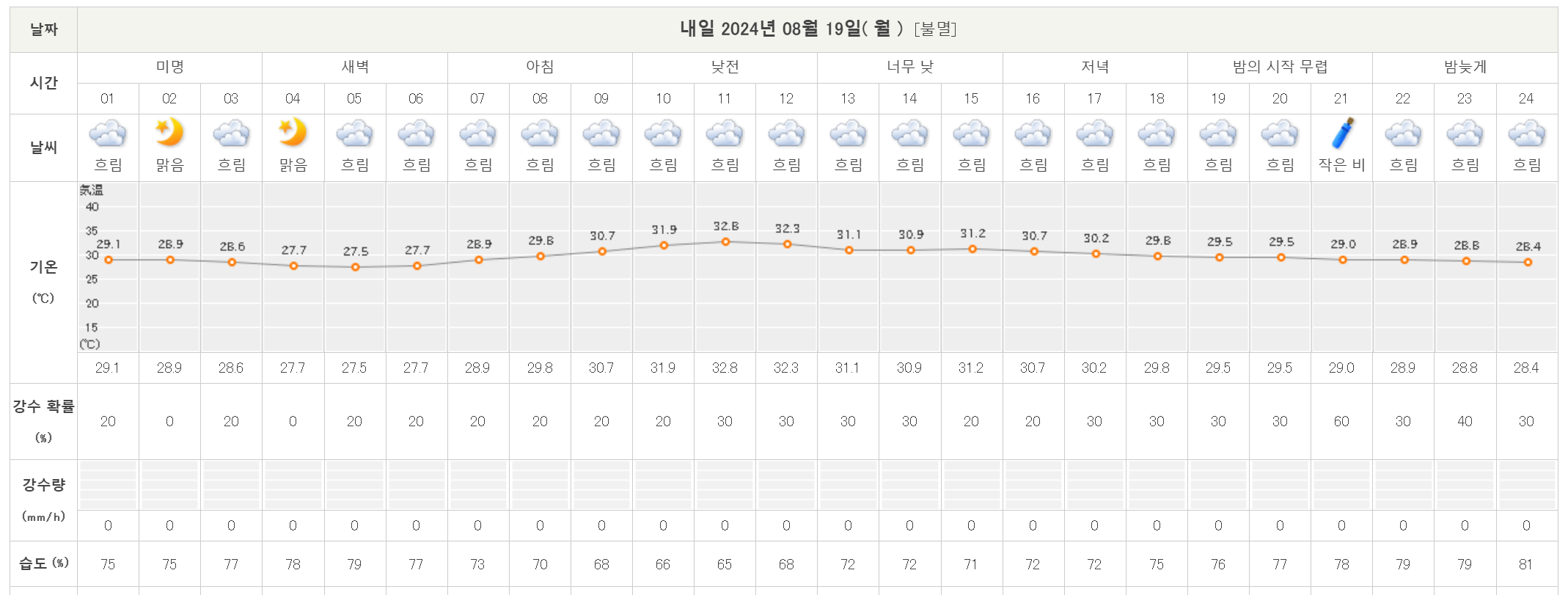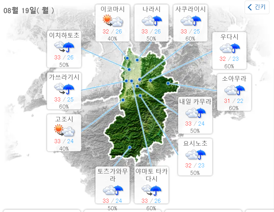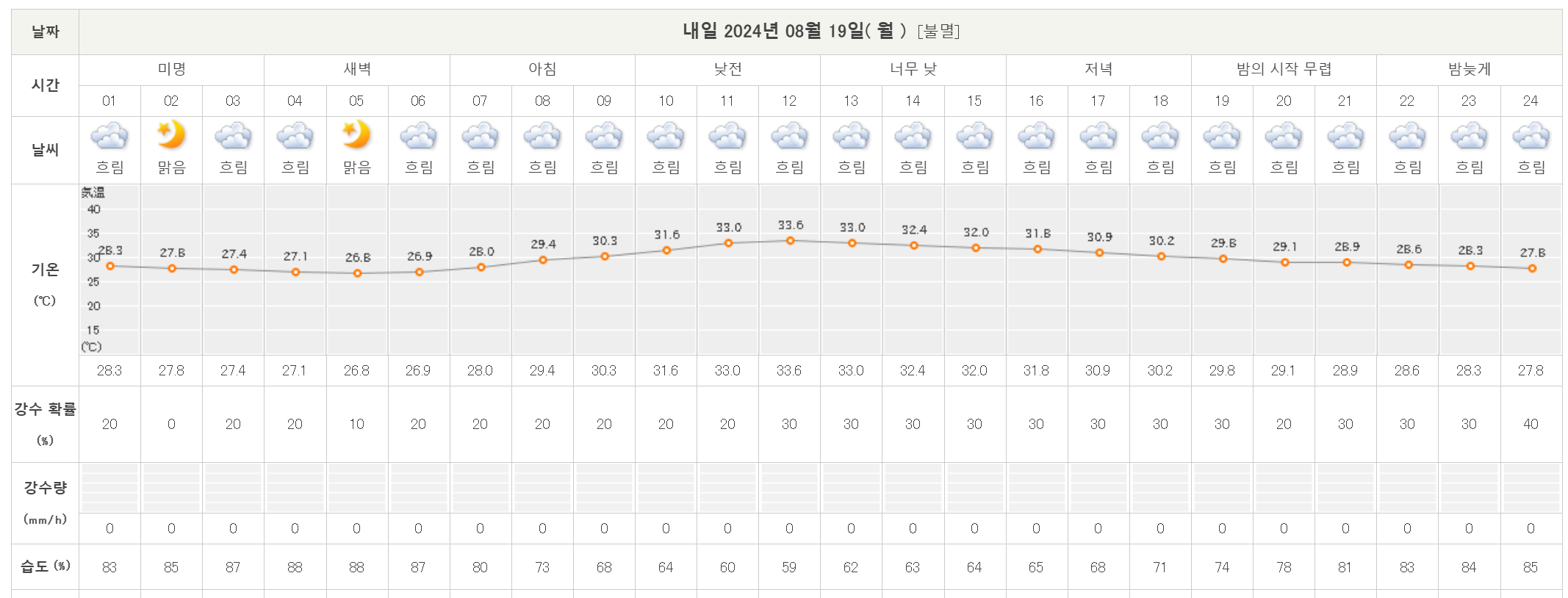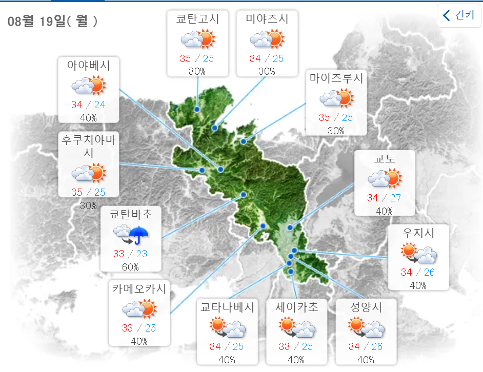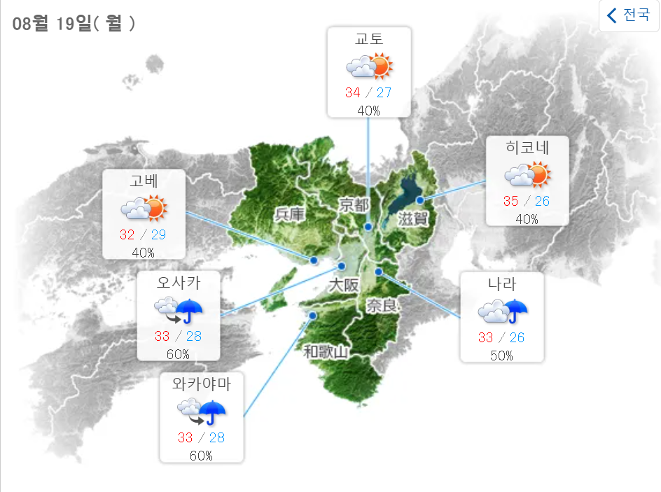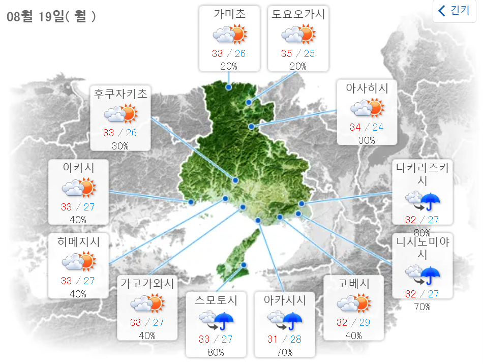 2024년 8월 19일 월요일, 오사카의 날씨는