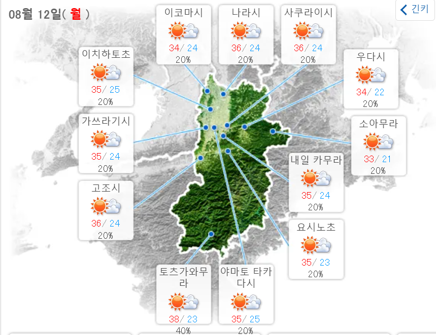 12일의 나라현은 습한 공기의 영향으로 대체로 흐릴 전망입니다.