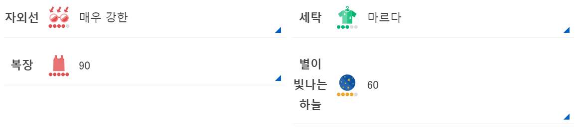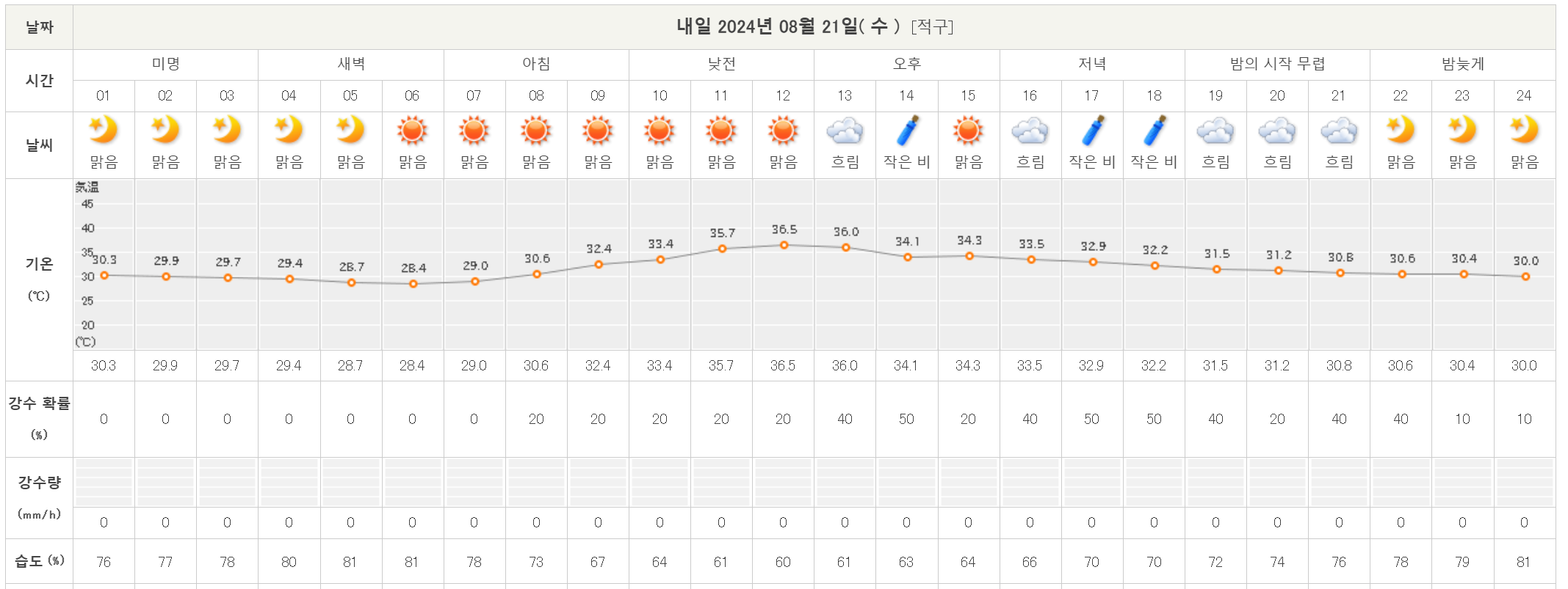 - 건강 관리 : 습도가 높고 무더운 날씨가 예상되므로, 충분한 수분 섭취와 함께 무더위를 피할 수 있는 얇고 통기성 좋은 옷차림이 필요합니다.