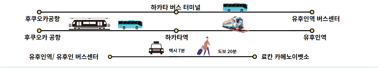 도보로는 약 20여분의 거리구요, 나는 죽었다깨어나도 캐리어끌고 걸어서는 못간다 하시는 분은 유후인역 앞에 대기하고 있는 택시들을 이용하시거나 료칸측에 택시를 요청하셔도 됩니다. 택시로는 약 7분정도의 거리네요.