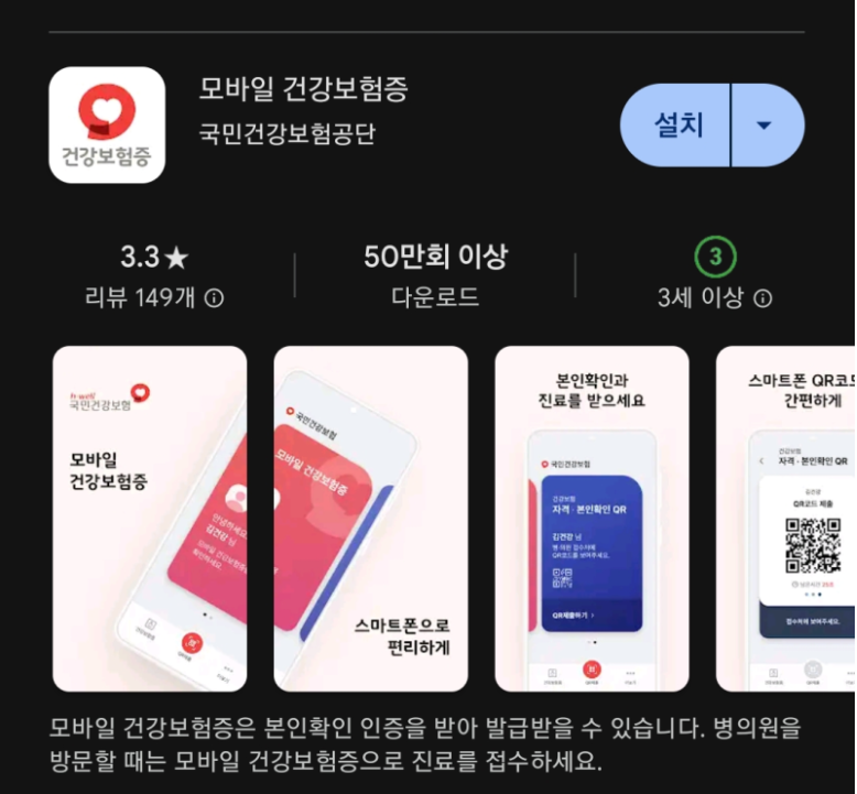 구글플레이에서 모바일 건강보험증을 검색, 설치를 진행합니다. 설치가 완료되면 어플을 실행하시고요.