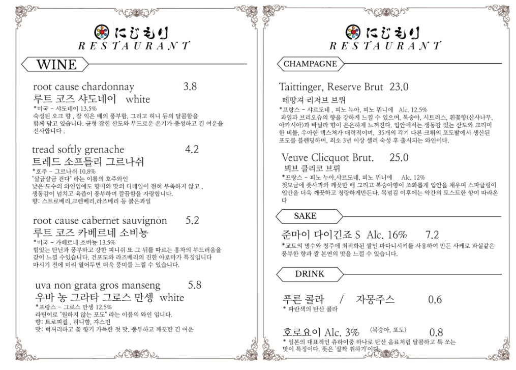 | 니지모리 상점가중 카메사케에서 도쿠리1병 제공 | 이용시간 ( 12:30 ~ 22:00 ) |