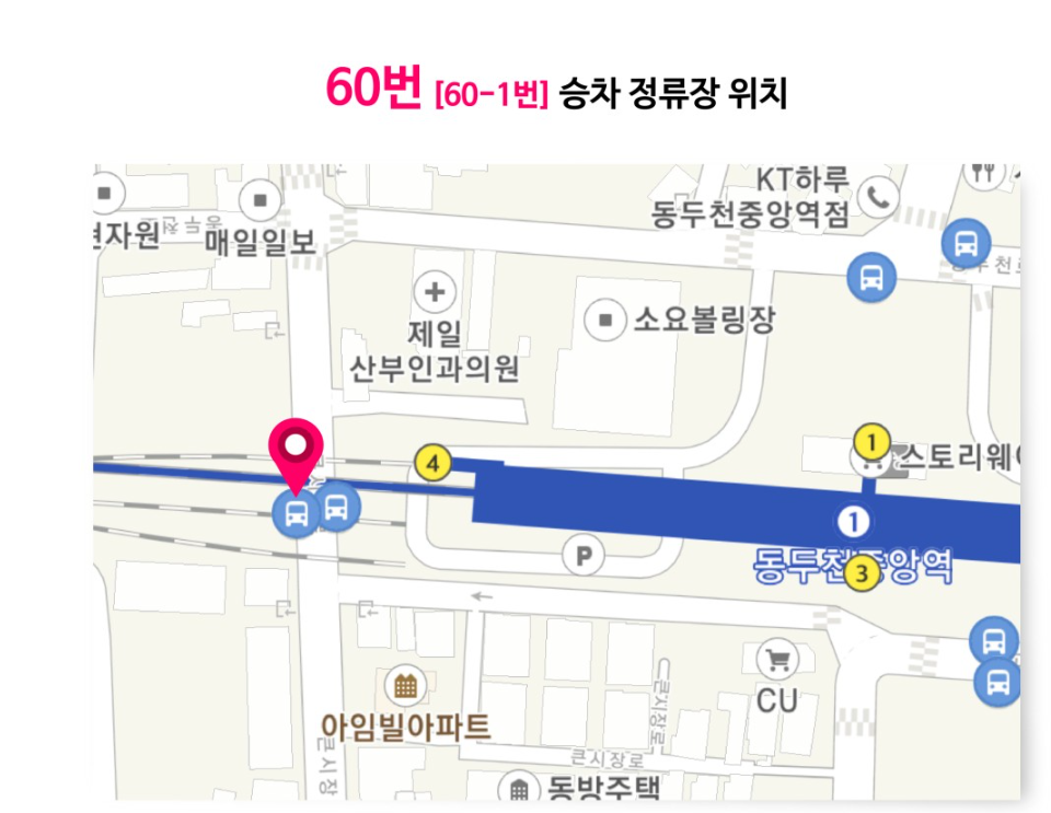 대중교통을 이용하셔서 오실 경우에는 1호선 동두천 중앙역 4번 출구 버스 정류장에서 60번이나 60-1번 버스를 탑승하거나 1호선 지행역 4번 출구 쪽 버스 정류장에서 11번이나 11-1번 버스를 탑승하시면 됩니다.