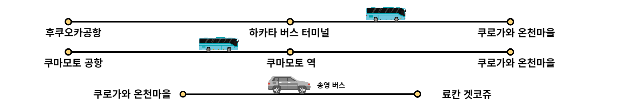 후쿠오카 공항이 아닌 구마모토 공항으로 입국하시는 경우에도 쿠로가와까지 직행 고속버스를 이용해 이동하실 수 있습니다. 송영신청은 다른 료칸들과 마찬가지로 료칸 예약할 때 미리 말씀해주셔야 합니다.