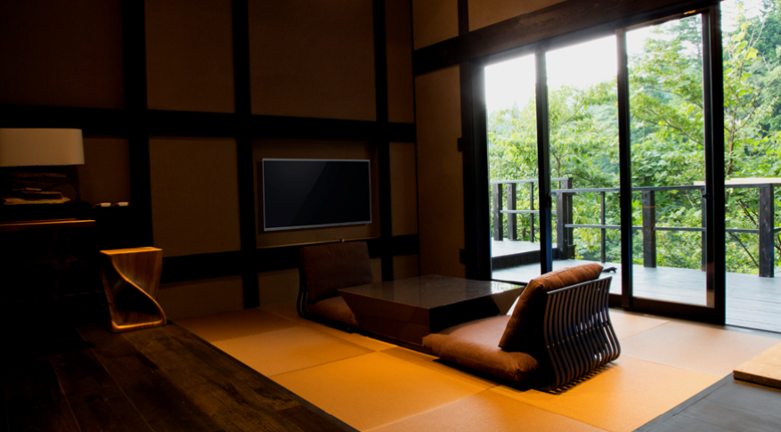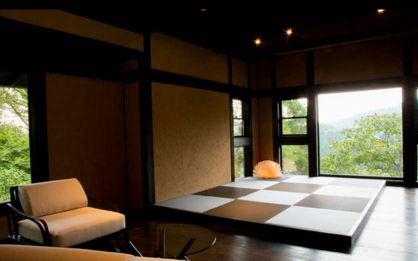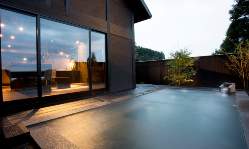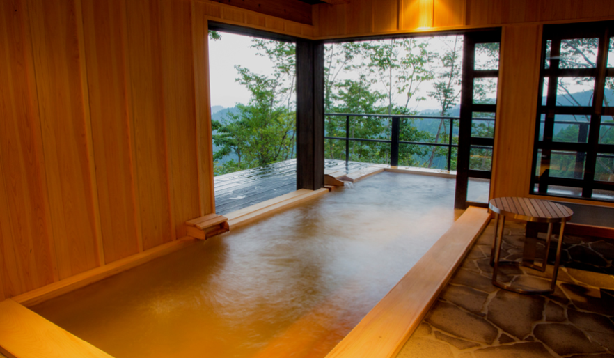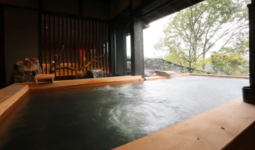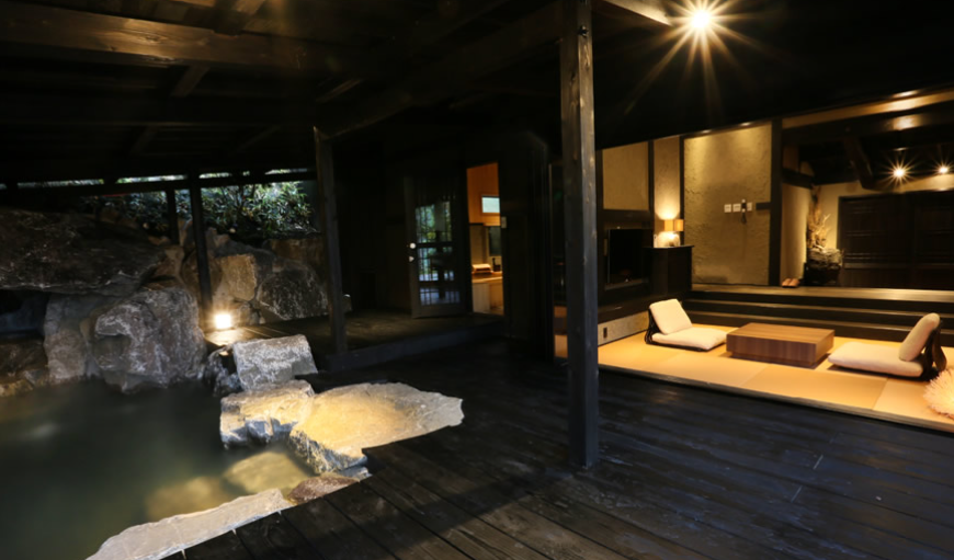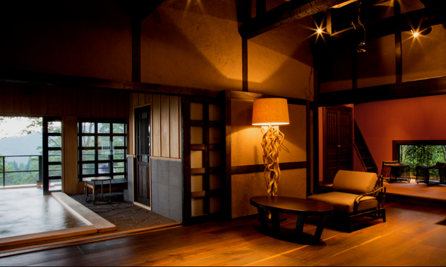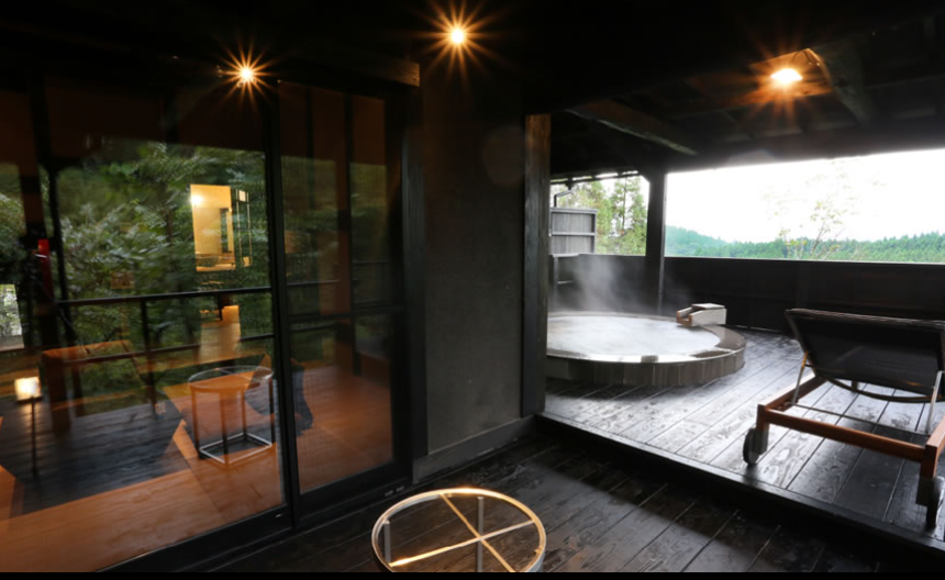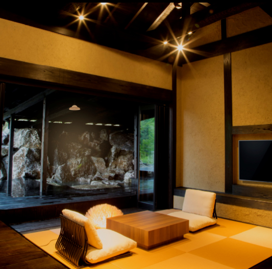 산들과 나무들에 둘러쌓여 프라이버시가 보장된 사치스러운 별장풍 구조의 료칸으로 모든 객실엔 원천에서 천연 온천수가 끊임없이 흘러내리는 실내 온천탕과 우드 테라스가 시공된 노천탕이 딸려있습니다.