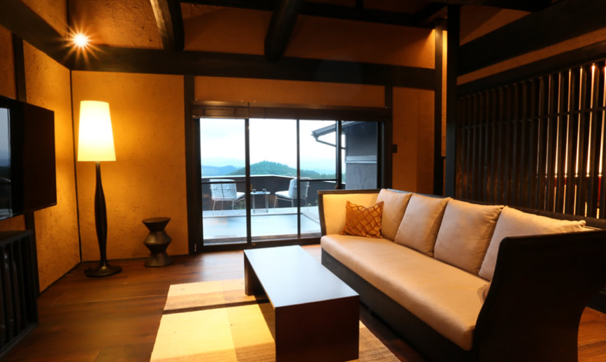 객실에 들어서는 순간 30평의 넓은 객실과 주변의 자연 풍광, 저 멀리 아소산까지 한 장의 그림이 되어 펼쳐지는 압권의 경치를 자랑하는 객실입니다.