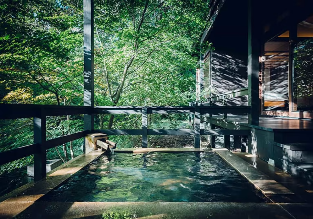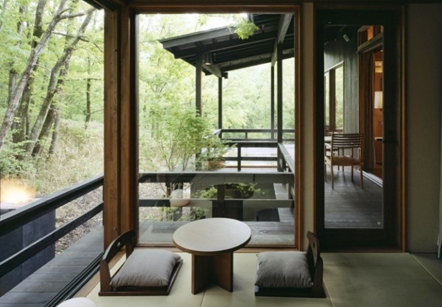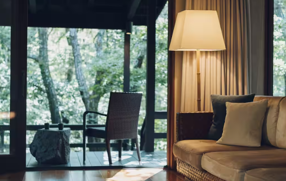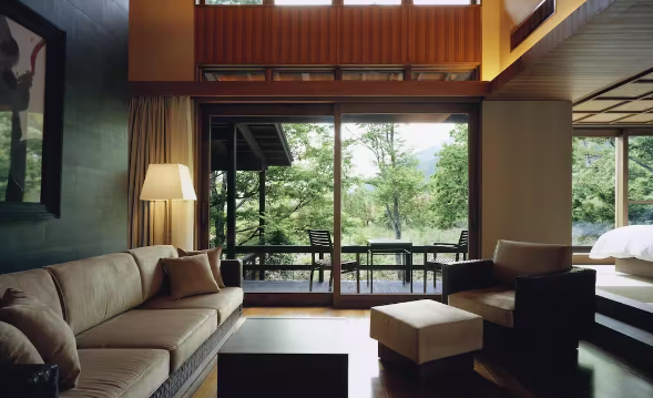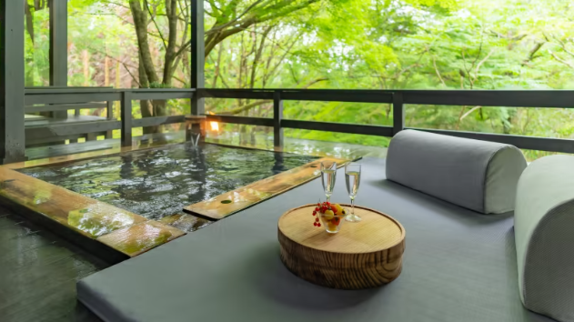 침실과 노천탕의 공간이 분류되어 있고 천고가 높아 개방감 있는 객실로 우드 디자인의 객실 곳곳에서 편안함을 누리실 수 있습니다. 거실의 소파에 앉으면 창문 밖의 빽빽하고 울창한 나무를 바라보며 바치 산림욕을 하는 듯한 느낌을 받으실 수 있고 온천을 하는데에 있어서도 마찬가지입니다.