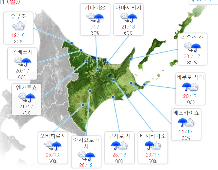 11일에는 구시로와 네무로 지방이 흐리고 가끔 비가 내릴 것으로 예상되며