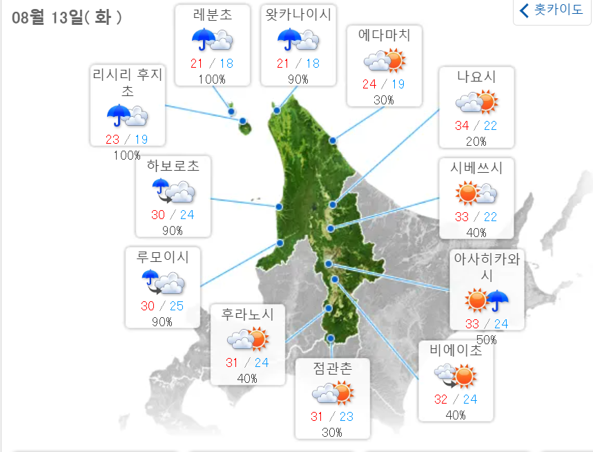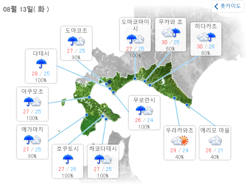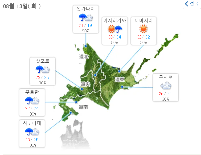 2024년 8월 13일 홋카이도 날씨 상세 예보