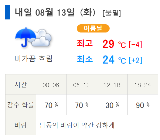 | 아침 최저 기온 | 낮 최고 기온 | 저녁 기온 | 밤 기온 | |