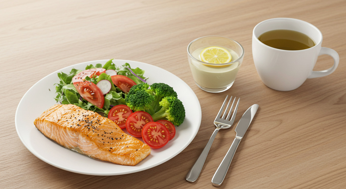 귀리죽 + 토마토 샐러드 + 연어구이 + 녹차 한 잔