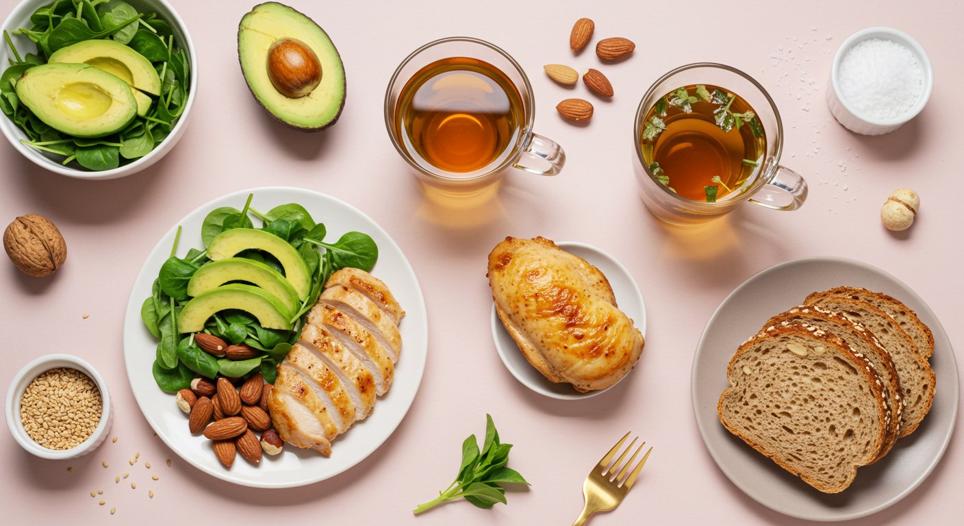 아보카도 샐러드 + 닭가슴살 구이 + 호두 한 줌 + 따뜻한 생강차
