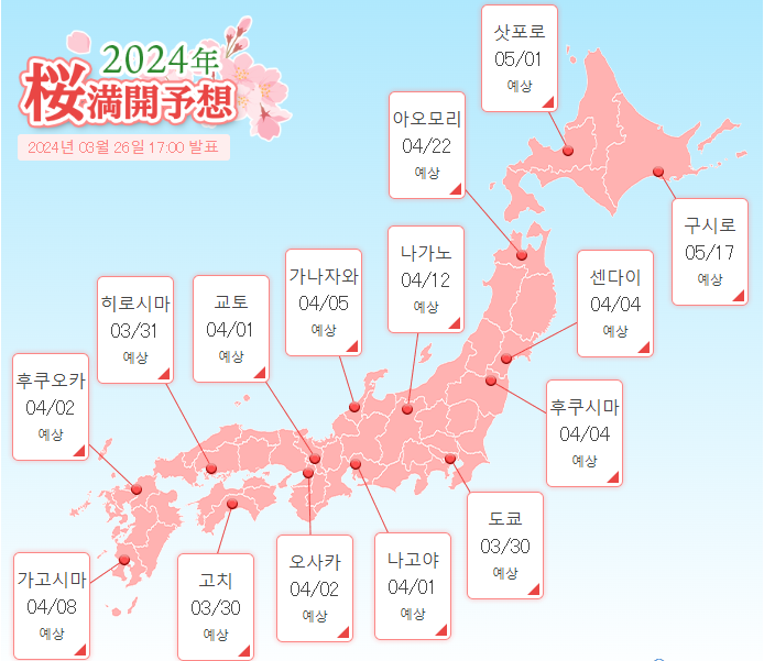 26일 자 날짜로 알아본 벚꽃 개화시기입니다.